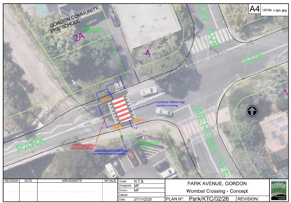 Ku-ring-gai Council is seeking community feedback on a proposal to replace the existing at-grade pedestrian crossing on Park Avenue, west of Werona Avenue, with a raised pedestrian (Wombat) crossing.